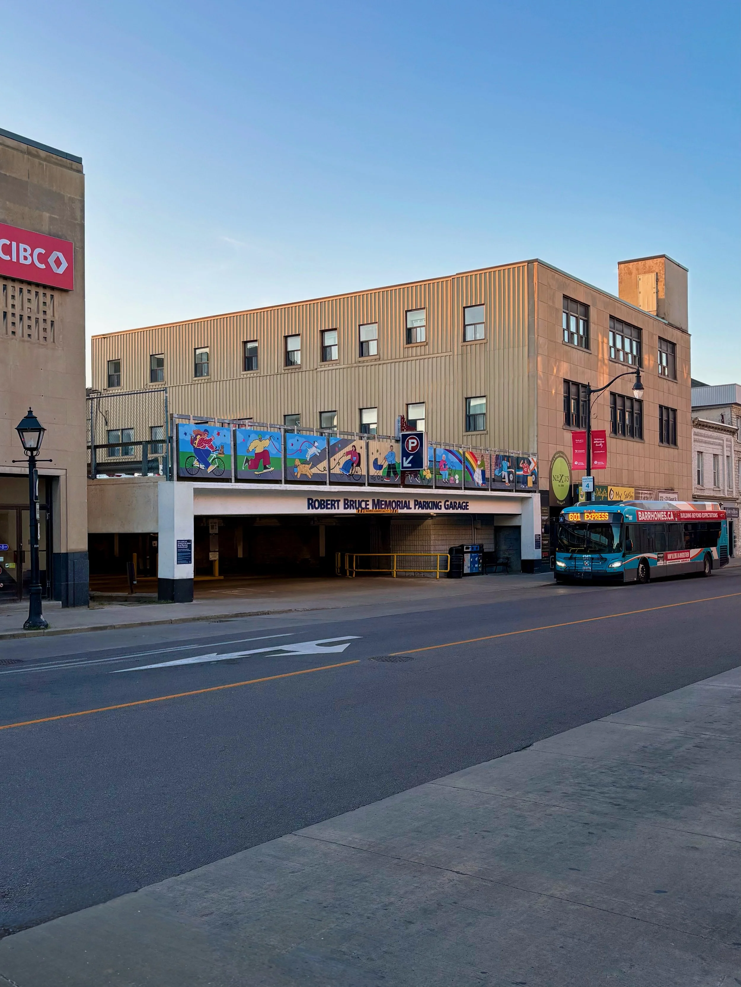Kingston in Motion is a large scale 10-panel public mural located on Bagot Street in downtown Kingston. Located above the Robert Bruce Memorial Parking Garage, the project was commissioned by the City of Kingston and funded by Kingston’s Parking Operations, Licensing, and Enforcement Department as part of the city’s Public Art Program. Installed in September 2025, Kingston in Motion features stylized figures that capture both movement and stillness, reflecting the daily rhythms of the Robert Bruce Memorial Parking Garage, a place where people pause, pass through, and gather. Cyclists, skateboarders, and pedestrians are contrasted with those who sit, stroll, or share goodbyes. At its center, a figure pauses to “smell the flowers,” encouraging rest amid the city’s pace.